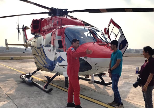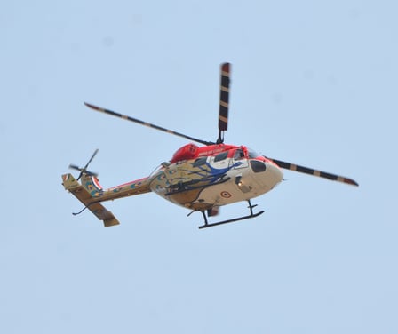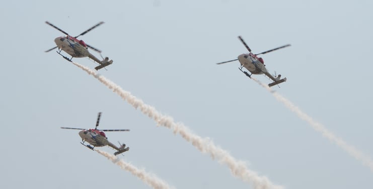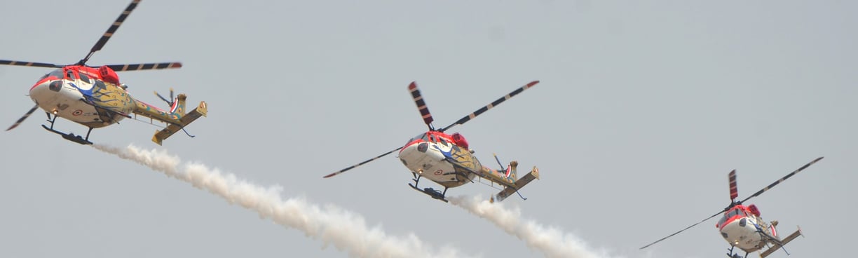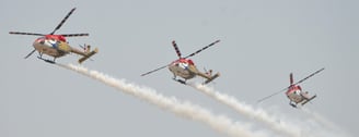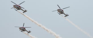 HAL Dhruv is a multi-role, multi-mission helicopter designed and produced by Hindustan Aeronautics Limited. The team performs a range of complex aerial manoeuvres like formations, loops and synchronized flying showcasing precision flying skills.
